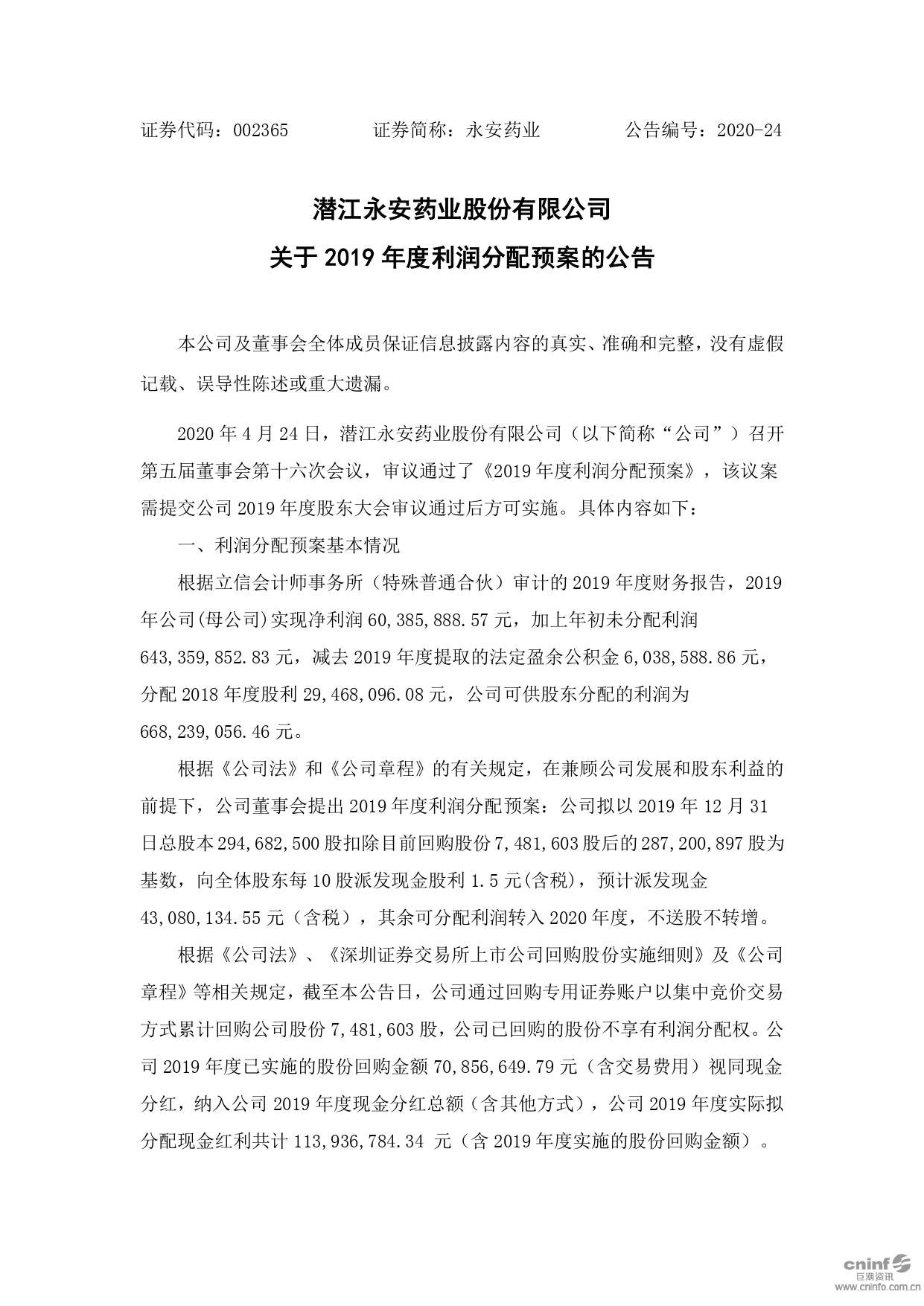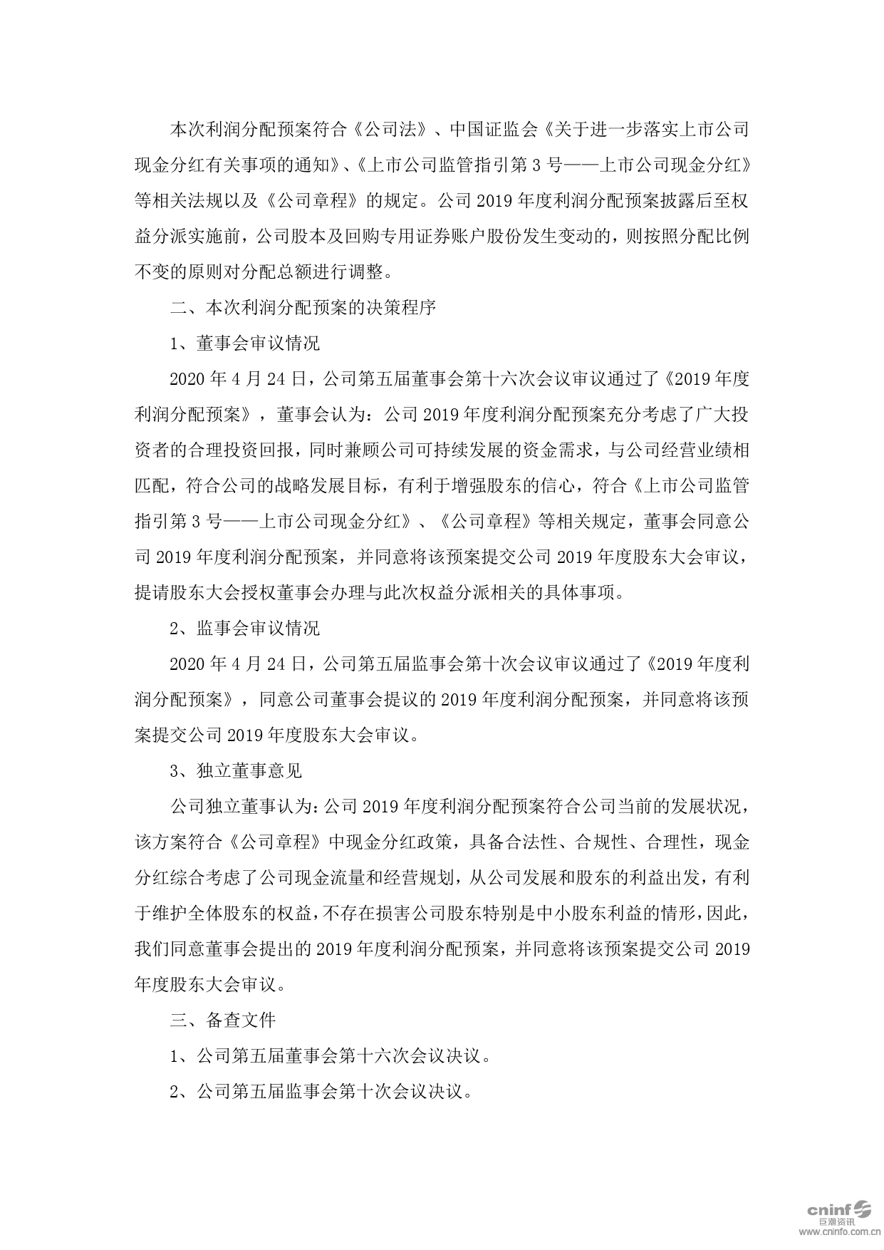 關(guān)于2019年度利潤(rùn)分配預(yù)案的公告