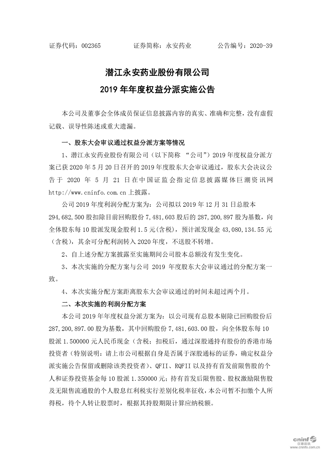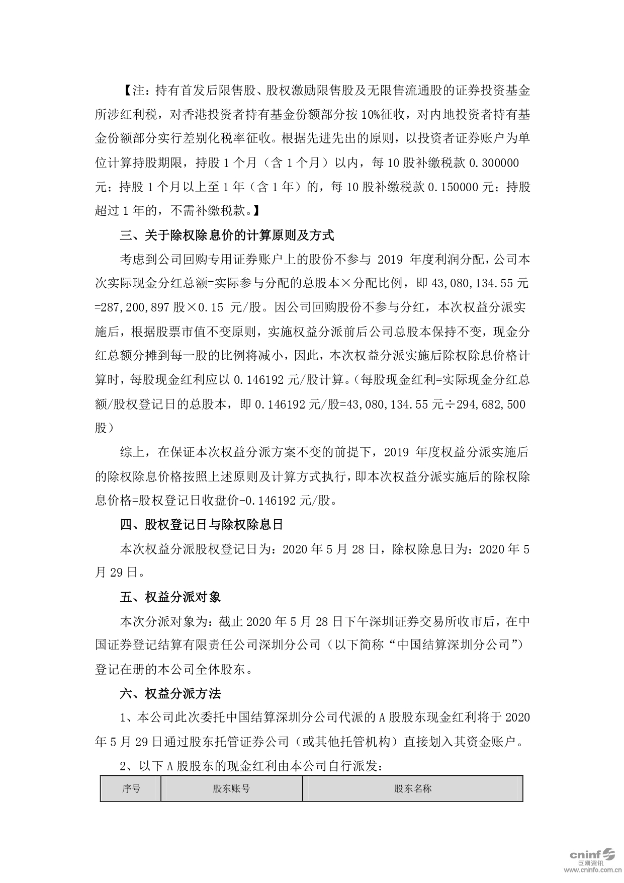 2019年年度權(quán)益分派實(shí)施公告