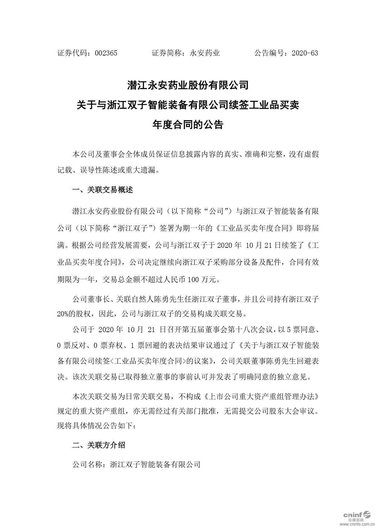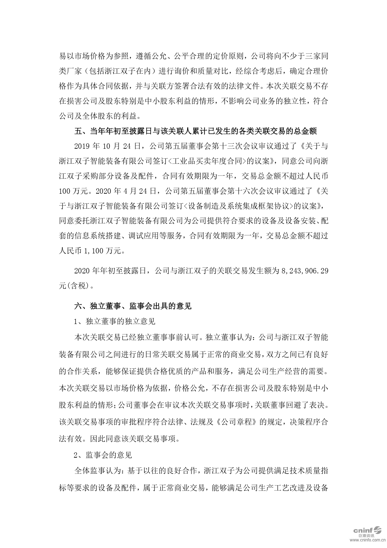 關(guān)于與浙江雙子智能裝備有限公司續(xù)簽工業(yè)品買賣年度合同的公告