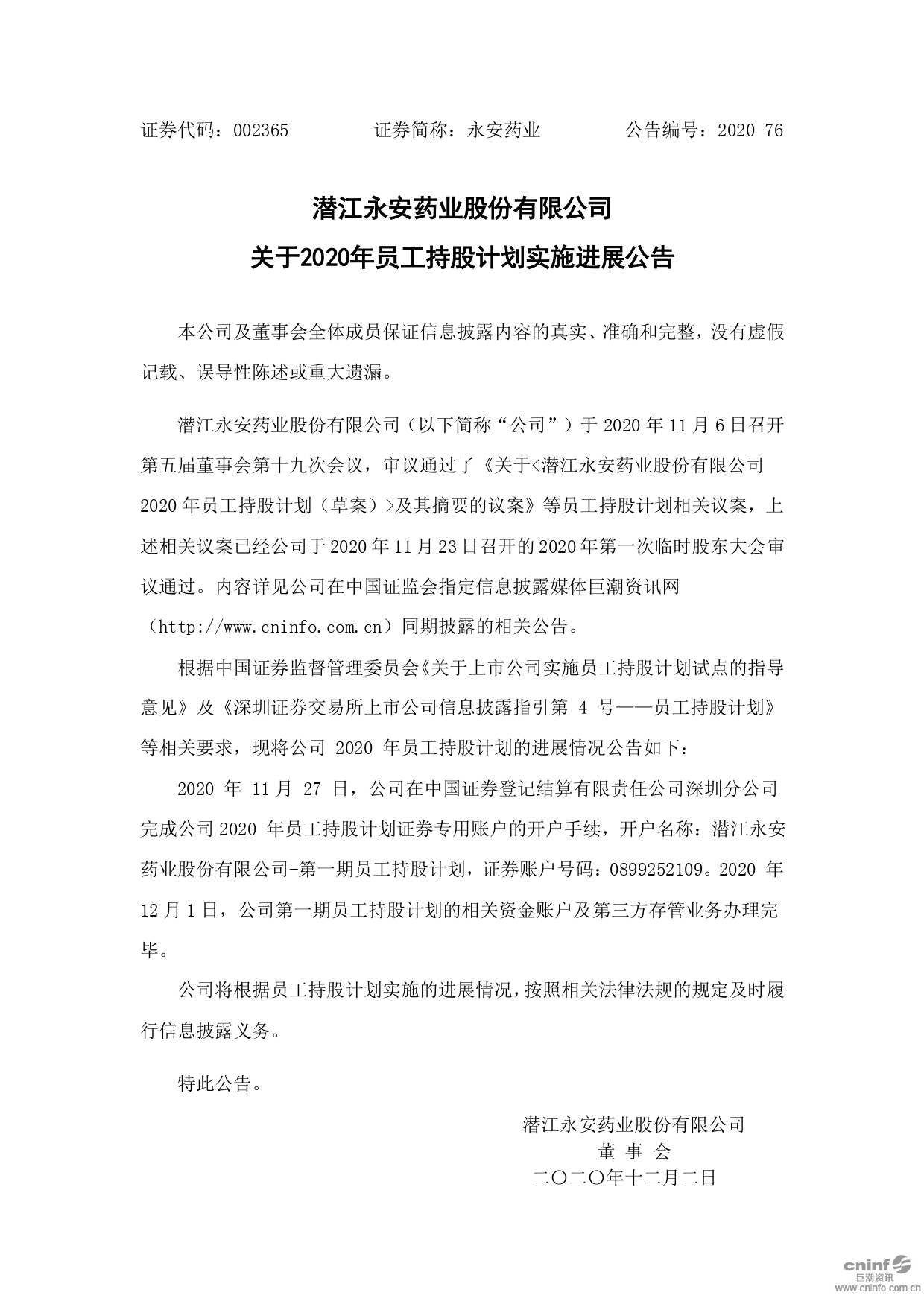 關(guān)于2020年員工持股計劃實施進展公告