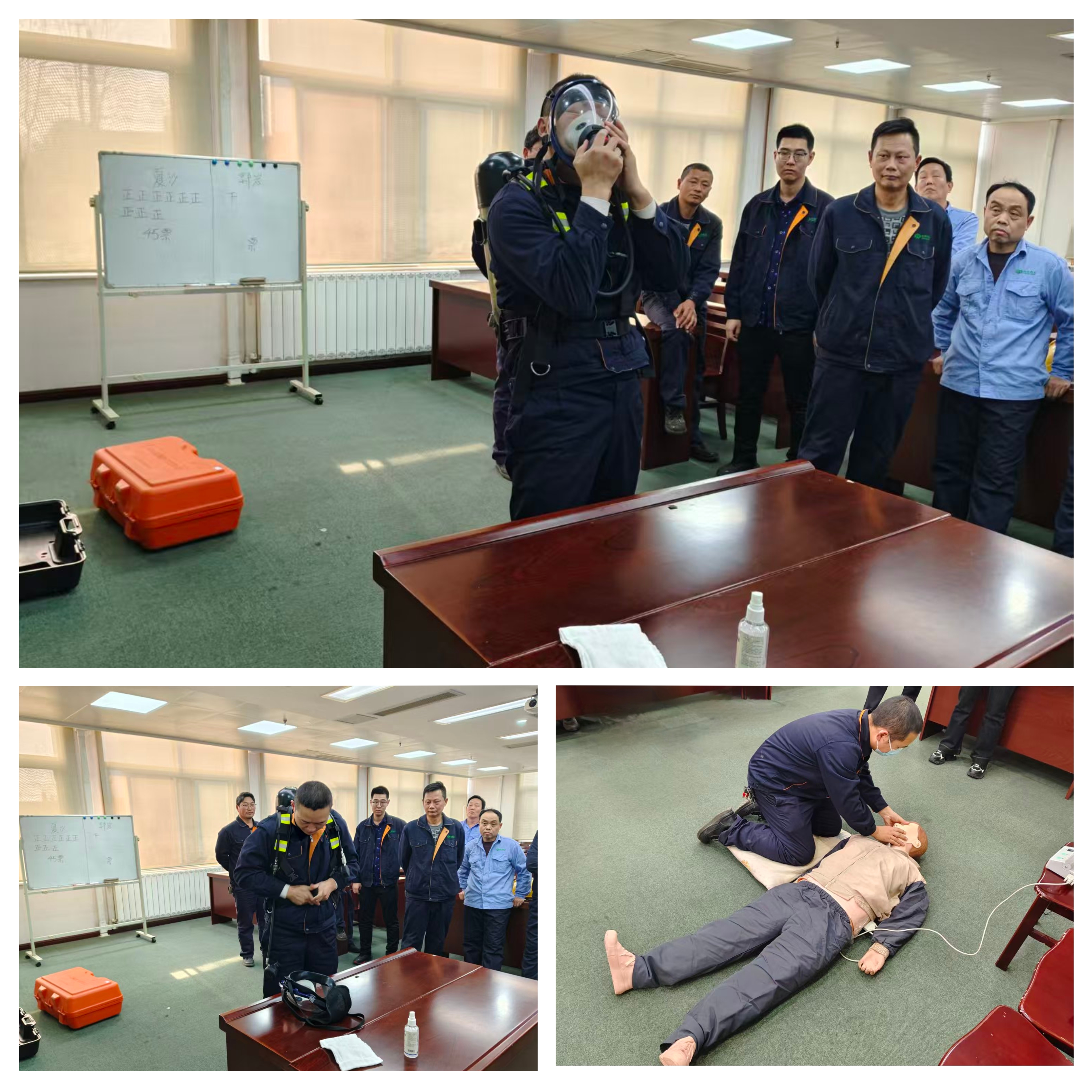 各小組緊張有序的開展“空氣呼吸器佩戴+心肺復(fù)蘇”雙技能實(shí)戰(zhàn)化演練。演練過程中,員工們嚴(yán)格按照操作規(guī)范執(zhí)行,從呼吸器佩戴的密封